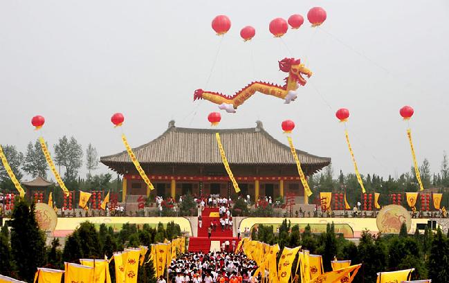 圖片說明:由海外華人捐資興建的中華三祖堂,位于軒轅湖以東,黃帝泉北200處,是中國黃帝城文化旅游區(qū)的中心景點。三祖堂是一座仿唐建筑,重檐飛角,恢弘壯闊,全部木質結構。全堂占地104畝,由平面祭壇、三祖堂、后殿組成。殿內三位祖先的塑像姿態(tài)各異栩栩如生,居中的黃帝氣宇軒昂,右側的炎帝睿智儒雅,左側的蚩尤勇武彪悍,塑像高6全部由泥土塑成。大殿四壁繪有涿鹿之戰(zhàn)、阪泉之戰(zhàn)、合符釜山、定都涿鹿四大歷史事件的大型壁畫。
