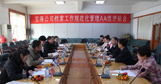 1月31日,由遼寧省檔案局業(yè)務(wù)指導(dǎo)處歐平處長(zhǎng)、副處長(zhǎng)葛仁軍、科員于佳,市檔案局趙壽安副局長(zhǎng)、王一鳴處長(zhǎng)、楊琳副處長(zhǎng)組成的評(píng)估組,到公司進(jìn)行檔案工作規(guī)范化管理“AA”級(jí)評(píng)估,經(jīng)過(guò)認(rèn)真細(xì)致的檢查,一致通過(guò)了公司檔案工作規(guī)范化管理“AA”級(jí)評(píng)估。