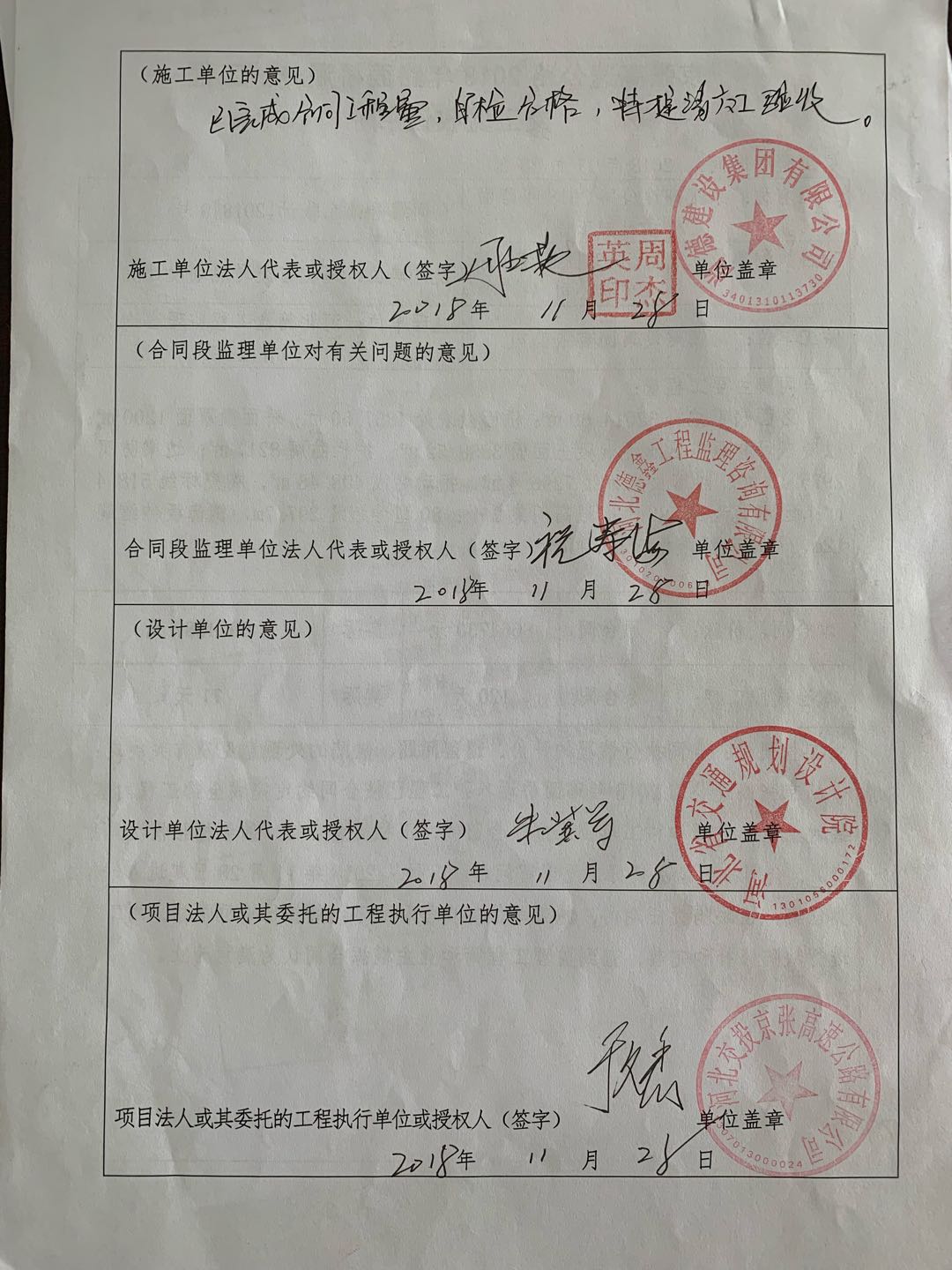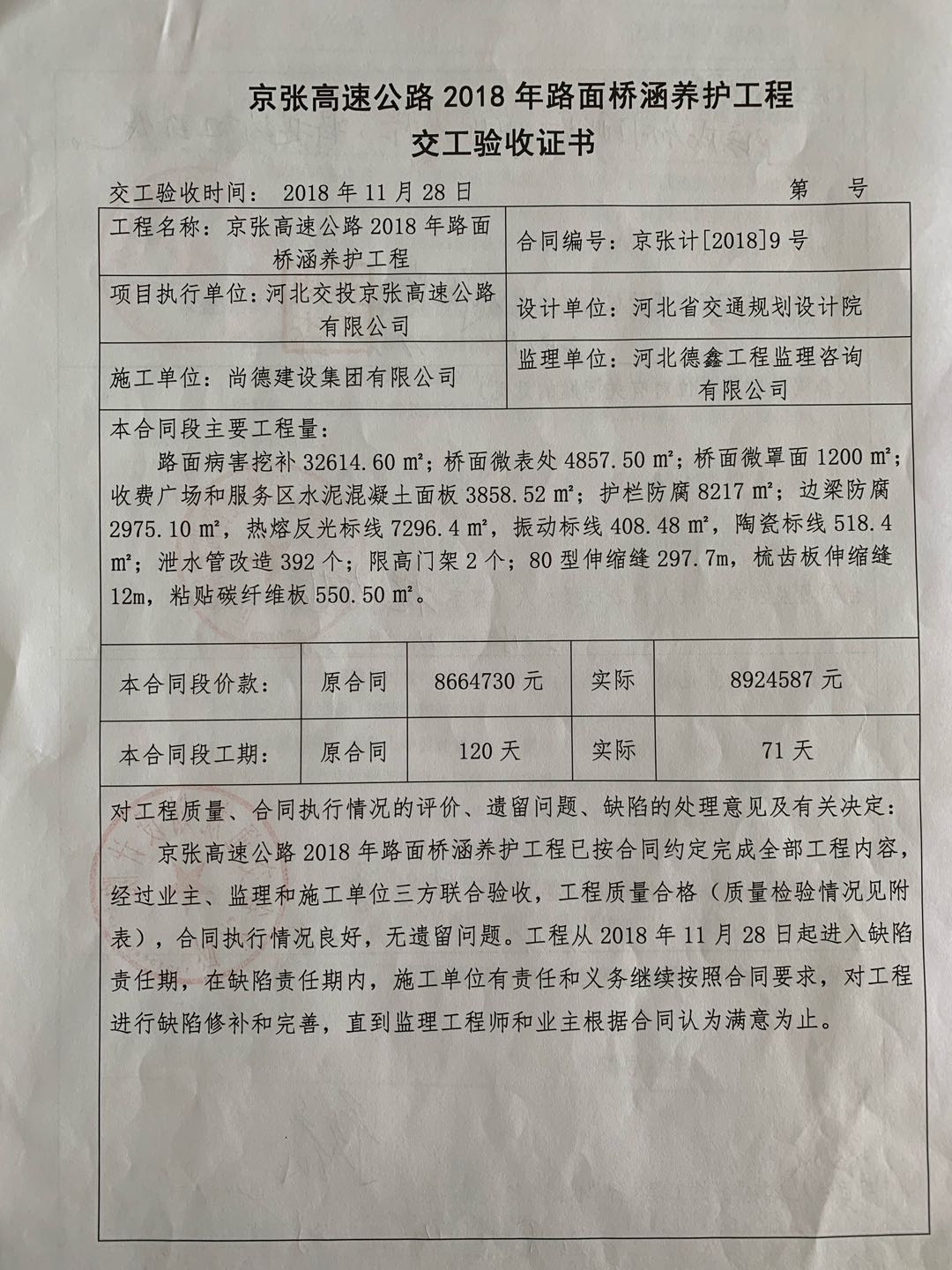 京張高速公路2018年路面橋涵養(yǎng)護(hù)工程交工驗(yàn)收證書