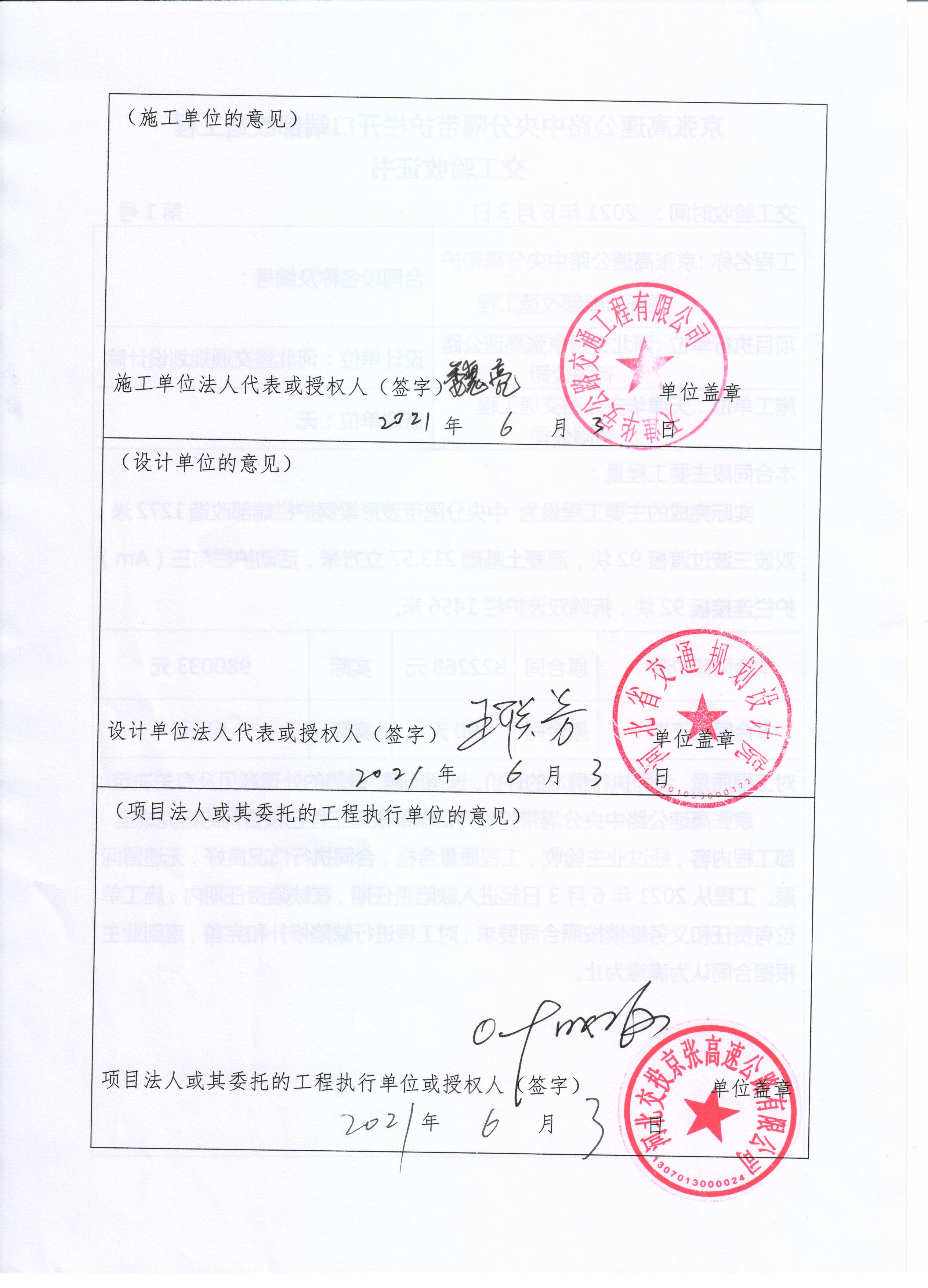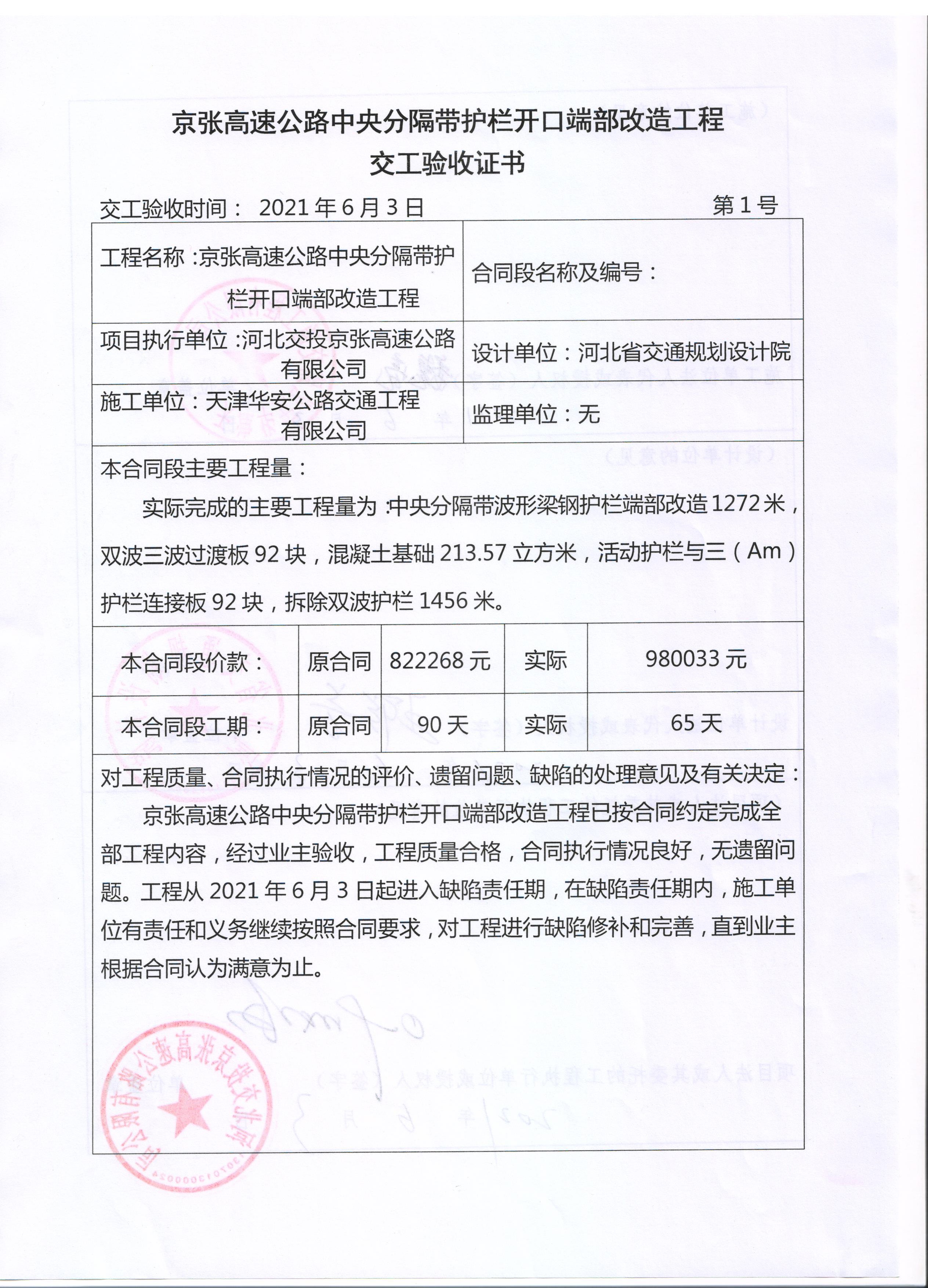京張高速公路中央分隔帶護(hù)欄開(kāi)口端部改造工程交工驗(yàn)收證書(shū)