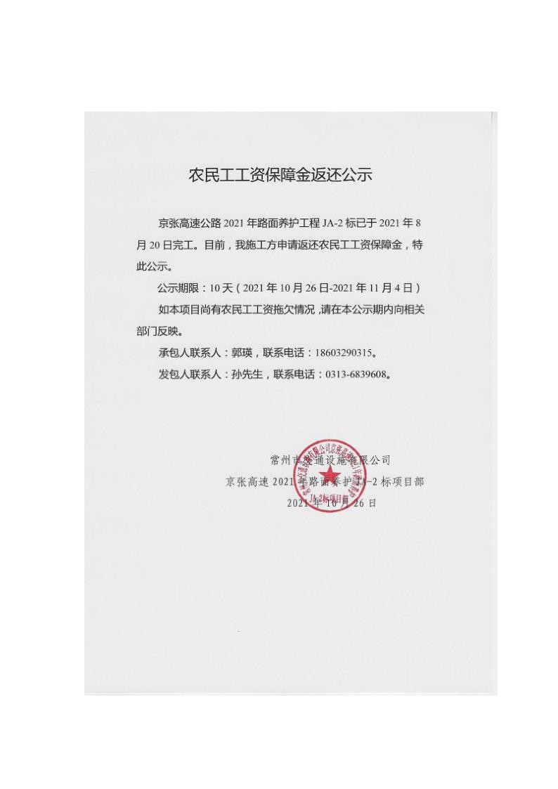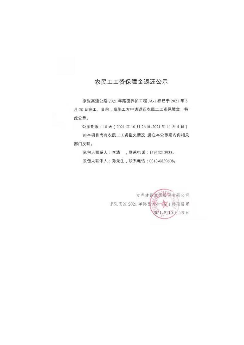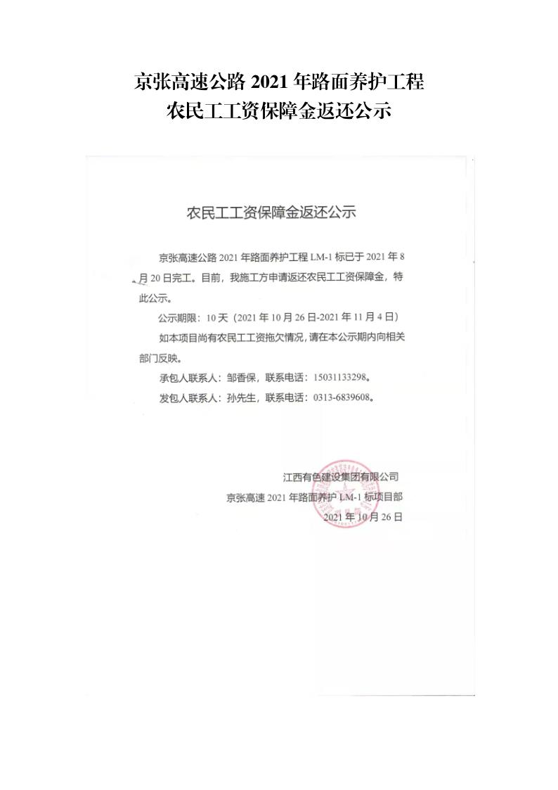 2021年路面養(yǎng)護(hù)工程農(nóng)民工工資保障金返還公示