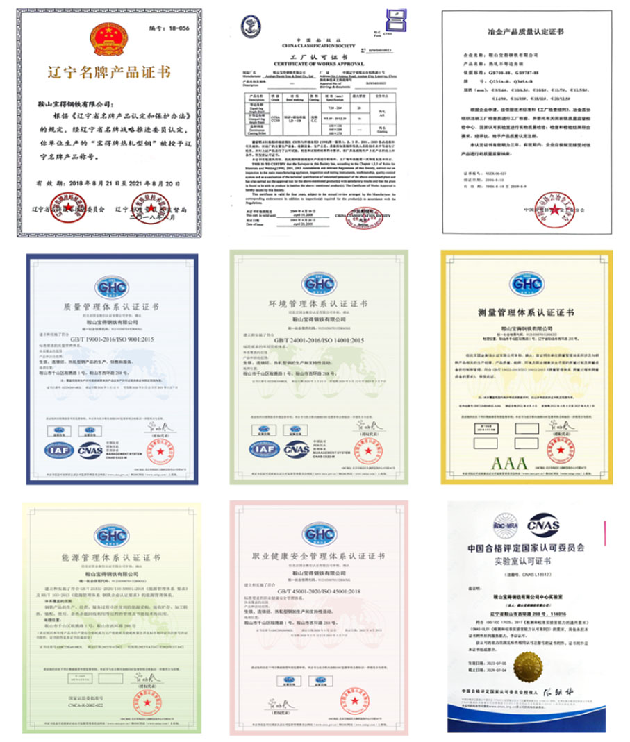 “寶得”牌鋼材以科學(xué)的管理,先進(jìn)的裝備,嚴(yán)格的檢測(cè)為保障,產(chǎn)品外型尺寸精度高,成分穩(wěn)定,性能可靠,表面質(zhì)量好,實(shí)物質(zhì)量高于國(guó)家標(biāo)準(zhǔn),達(dá)到發(fā)達(dá)國(guó)家同類產(chǎn)品水平,屢獲國(guó)家“冶金產(chǎn)品實(shí)物質(zhì)量金杯獎(jiǎng)” 和“遼寧省名牌產(chǎn)品”稱號(hào)。公司通過(guò)了GB/T 19001/ISO 9001質(zhì)量管理體系、GB/T 24001/ ISO 14001環(huán)境管理體系、GB/T 45001/ISO 45001職業(yè)健康安全管理體系、GB/T 23331 / ISO 50001和RB/T 103能源管理體系、GB/T 19022/ISO 10012測(cè)量管理體系審核認(rèn)證,獲得方圓標(biāo)志認(rèn)證中心頒發(fā)的“管理創(chuàng)新獎(jiǎng)”,取得國(guó)家船級(jí)社(CCS)的生產(chǎn)工廠認(rèn)可證書和遼寧省進(jìn)出口檢驗(yàn)檢疫局頒發(fā)的“產(chǎn)品出口免檢認(rèn)可證書”。